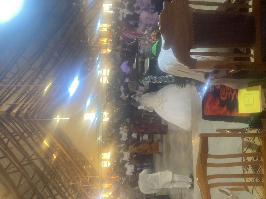The scene is an interior view of a large church in Bukuru, Nigeria, densely occupied by a congregation