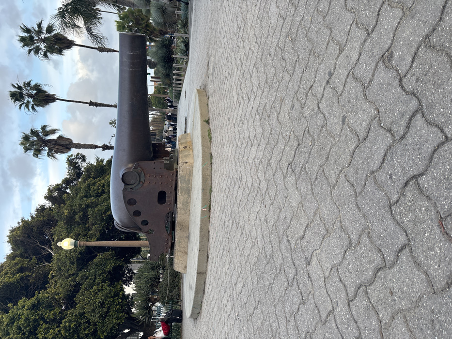 An old cannon stands on a concrete platform beside a paved area, angled towards the sky. Palm trees line the horizon. The cannon's rusty metal surface shows signs of age. Green trees and a lamppost flank one side of the cannon. The sky is overcast with hints of blue. People are gathered in the background beyond the cannon.