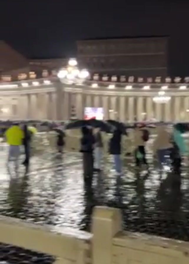 rainy night in St. Peter's Square, Vatican City. Several people with umbrellas are walking around the square, which is illuminated by streetlights. In the background, the Basilica is visible, also lit up. The ground is wet, reflecting the light. A white barrier is in the foreground, separating the viewer from the crowd. A Christmas tree can be seen to the right of the frame.
