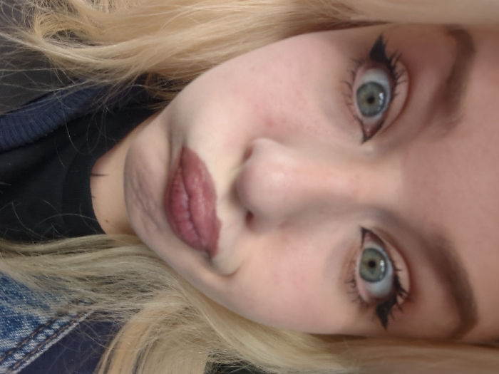 A close-up, frontal portrait of a person making an exaggerated facial expression in an unspecified indoor or close-up setting within Area D (Elaho/Garibaldi), Canada. The individual has fair skin, prominent green/blue eyes, and blonde hair visible on either side of the face. The eyes are wide open, pupils slightly dilated, with dark winged eyeliner and mascara applied. The eyebrows are light brown and slightly arched. The mouth is pursed with the lower lip pushed up, and the cheeks are slightly puffed out. Dark reddish-brown lipstick is applied. Slight freckling is visible on the nose and cheeks. The individual wears a dark-colored top, possibly black, beneath a blue denim jacket or a garment with a dark blue ribbed collar. A faint dark line, potentially a small tattoo, is visible on the lower neck. The background is out of focus and indistinct.