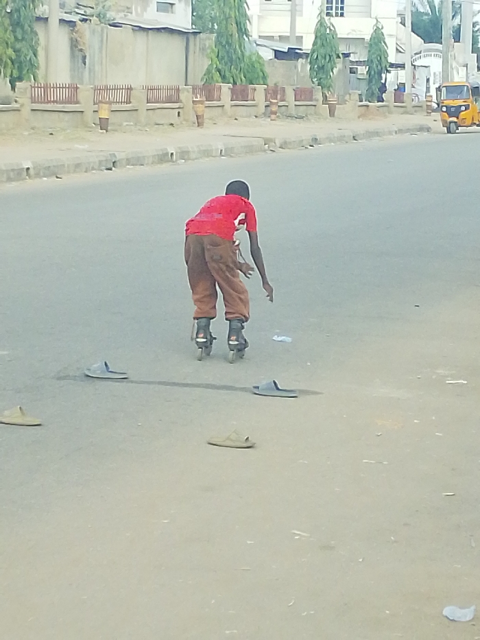 A person on roller skates stands on an asphalt road, bending forward with arms outstretched. Scattered around are several pairs of sandals. In the background, buildings, trees, and a tricycle are visible. The person is wearing a red shirt and brown pants. The scene is set on a street with sidewalks and decorative planters along the side.