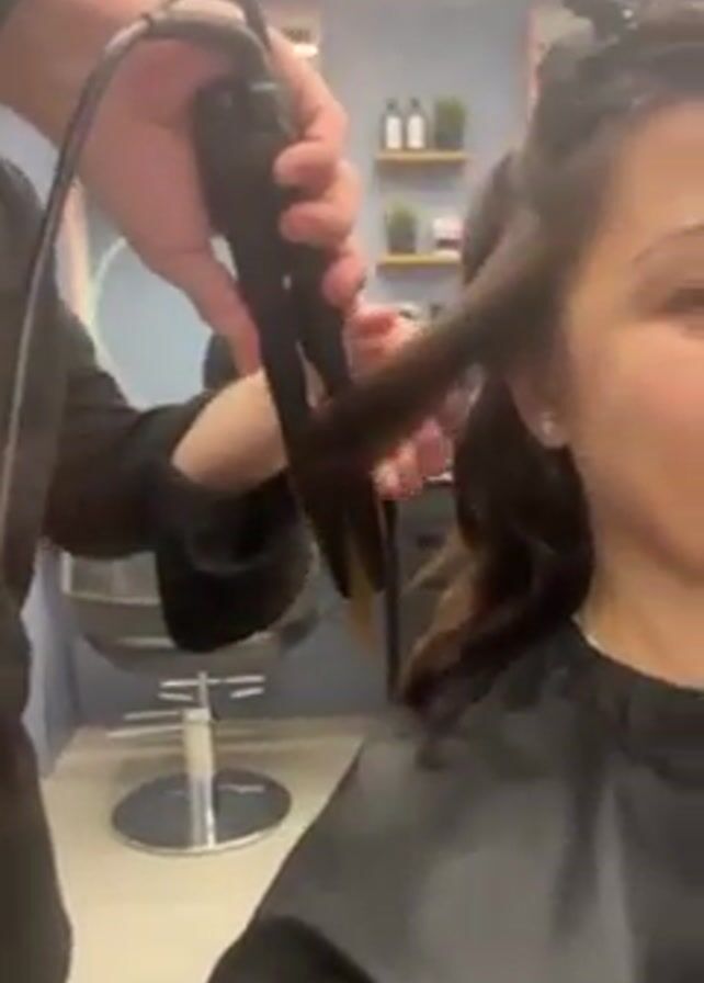 A man is curling a woman's hair with a curling iron. The woman is seated in a salon chair, wearing a black salon cape. The man, who is wearing a black shirt, holds a strand of the woman's dark hair and wraps it around the curling iron. She is smiling, and her hair is partially styled in waves or curls. A salon mirror is visible in the background, reflecting the man. Shelves with salon products are also visible in the background. A sign that says, "PERFECT HAIR STARTS HERE" is seen on the wall. The man appears to be a hairdresser or stylist working on the woman's hair at a salon.