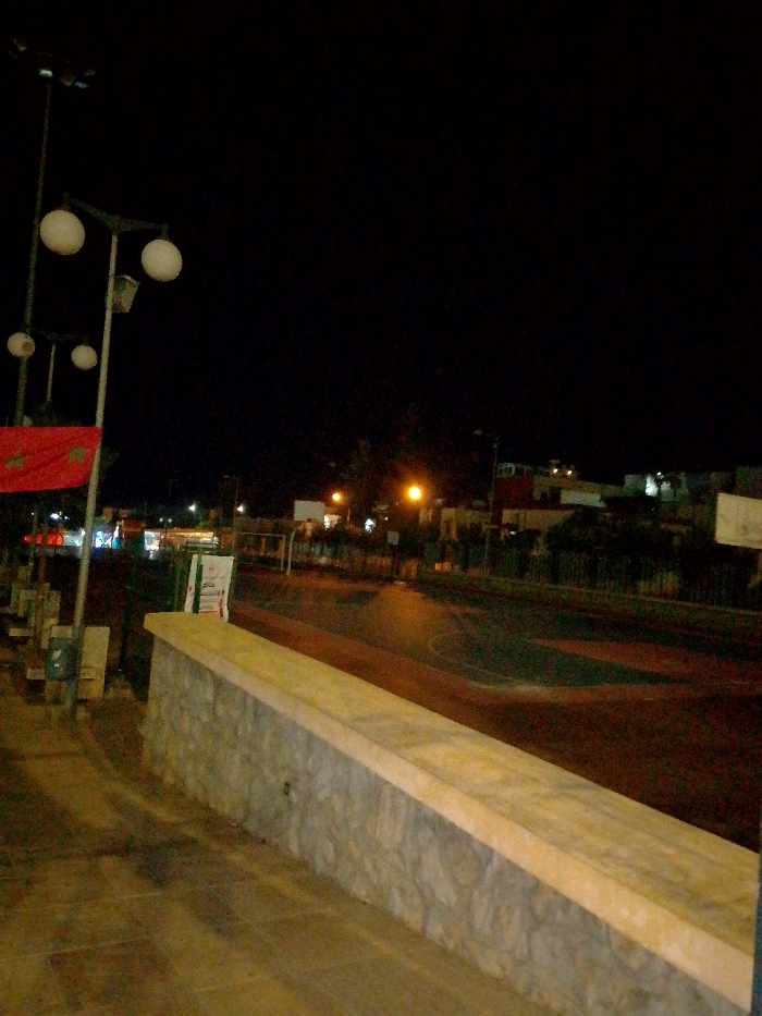 This nighttime image depicts a deserted urban scene in the city of Meknes, Morocco