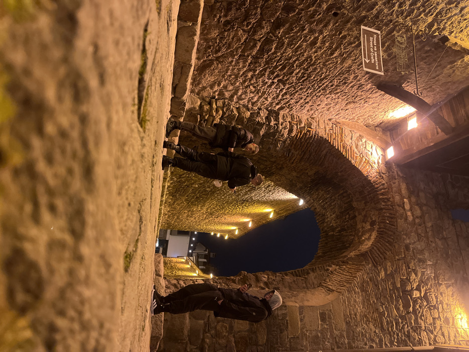 The image depicts a nighttime scene in the Old Town of Plovdiv, Bulgaria, specifically at the entrance to the "Street of Crafts" as indicated by a directional sign. Three male individuals are present on a cobblestone street beneath a stone archway. The archway, constructed from rough-hewn stones and bricks, spans the width of the path. Above the arch, wooden beams are visible, with several square-shaped artificial lights mounted to illuminate the structure. More upward-pointing lights are affixed to the stone walls lining the pathway beyond the arch, casting a warm orange glow. The ground is paved with irregular cobblestones. The sky visible through the archway is dark blue, indicating evening or night. On the left side, a male individual in a dark puffer jacket and dark trousers stands facing right, appearing to smoke a cigarette, with a wisp of smoke visible near his face. Next to him, a second male, also in dark attire, looks down. A white object, possibly a face mask, is discernible near his right leg. On the right side, a third male stands with his back partially to the viewer, leaning against the stone wall. He wears a dark hooded jacket with the hood up, dark trousers, and Adidas athletic shoes. He is engrossed in a smartphone, which he holds with both hands.