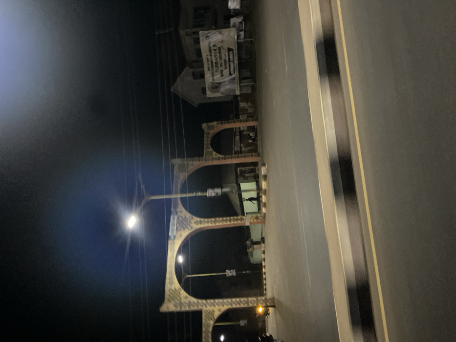 A dark nighttime scene shows a street with a decorative archway spanning it. The archway is comprised of multiple arched openings, and is illuminated by streetlights attached to it. A streetlight shines brightly in the lower left. Adjacent to the archway, a building can be seen with a sign on its facade. The street is marked with white lines, and appears to be mostly empty. The photograph's orientation is rotated 90 degrees.