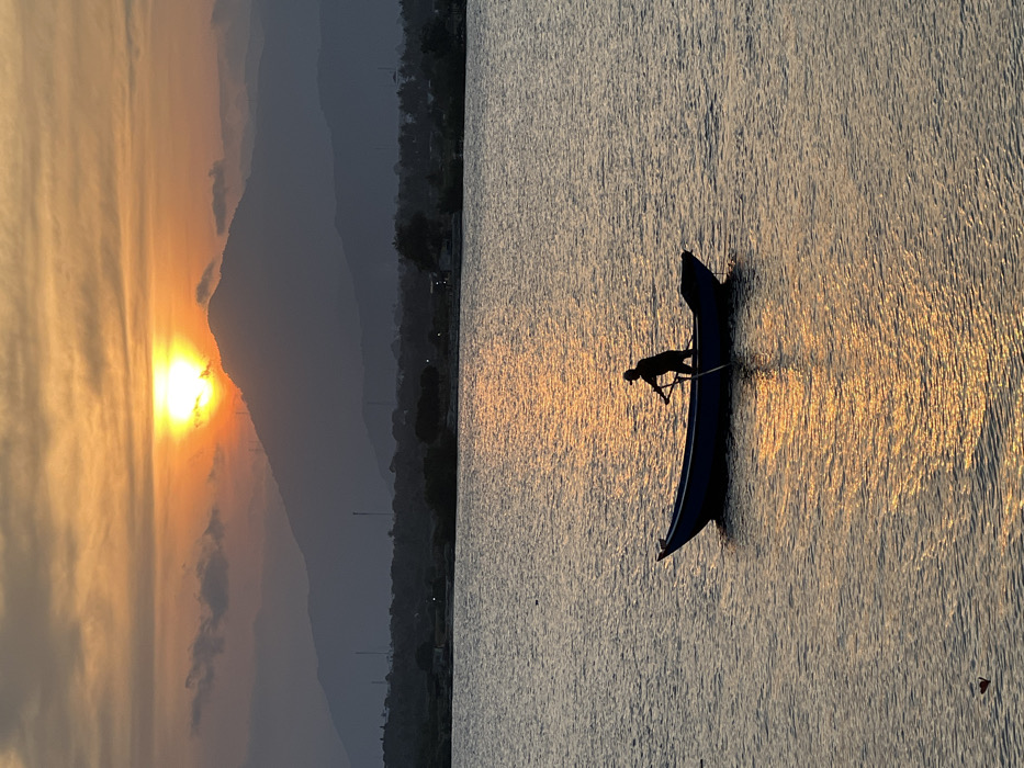 The image depicts a sunset over a body of water in Cam Đức, Vietnam. A lone, silhouetted individual stands within a dark blue, open boat in the midground, actively propelling it with an oar. The sun, a bright orange circle, is positioned high on the horizon, partially obscured by the peaks of a prominent, dark mountain range. The water's surface reflects the intense orange and yellow light of the sun, exhibiting visible ripples. Beyond the water, a dark, low-lying shoreline with indistinct vegetation and structures separates the foreground from the layered, silhouetted mountains in the background. The sky displays a gradient of orange, yellow, and grey hues, with scattered clouds.