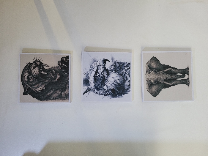 - "Three framed monochrome artworks depicting animals are vertically mounted on a plain, light-colored wall in Jos, Nigeria" by FM-9qH0E3, licensed under CC BY 4.0