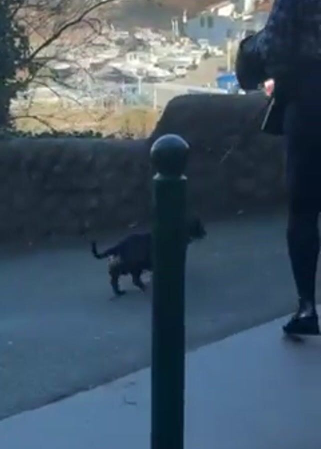 A small, dark-colored dachshund on a leash walks along a paved path. The dog has a blue harness on. A person in a dark blue patterned jacket and black pants stands nearby, holding the leash. In the background, there is a view of buildings, trees, and a harbor or marina. The dog stops to sniff at a white pole. The weather appears sunny.