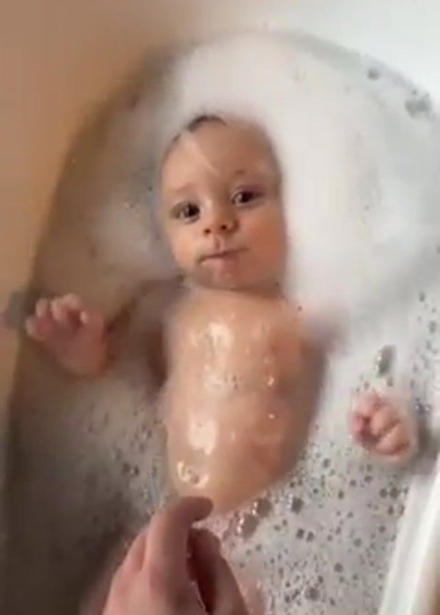 A baby is taking a bath in a small, white tub. The baby is lying on its back, partially submerged in water that is full of soap bubbles. The baby is looking directly at the camera with a neutral expression. An adult hand is seen at the bottom left of the frame, partially submerged in the water. The tub has a black and white panda decal at the top. The lighting is bright.