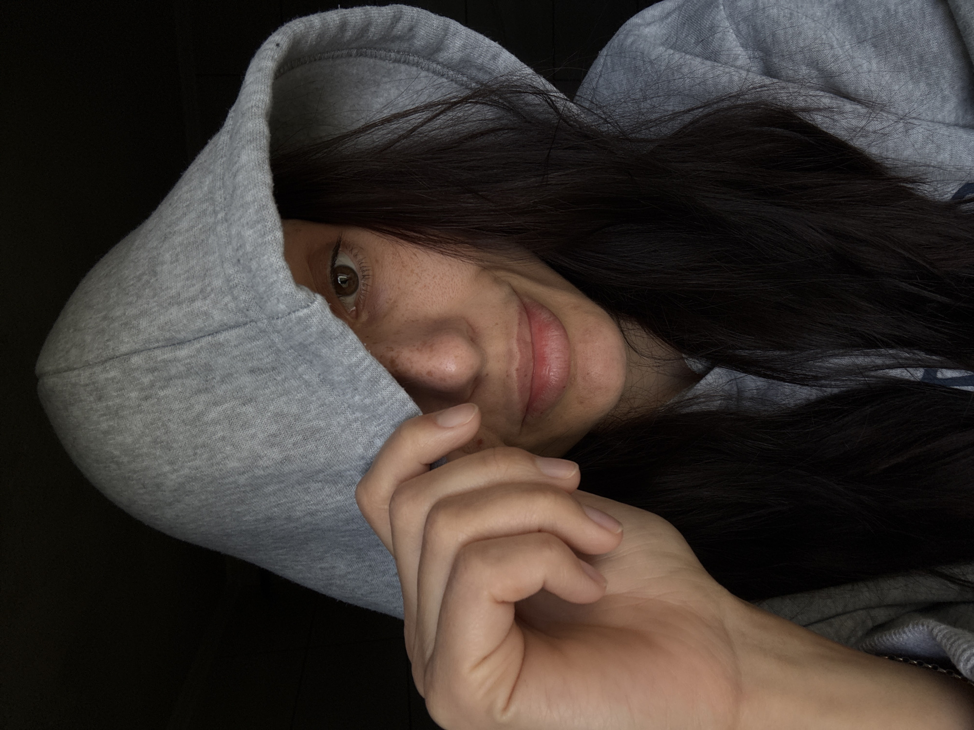 A close-up photograph shows a person wearing a gray hooded sweatshirt. The hood is pulled up and partially obscures the face. The person has dark hair, fair skin, and freckles. One eye is visible, and the person's hand is near their face. The background is dark and indistinct. The location is not discernible from the image.