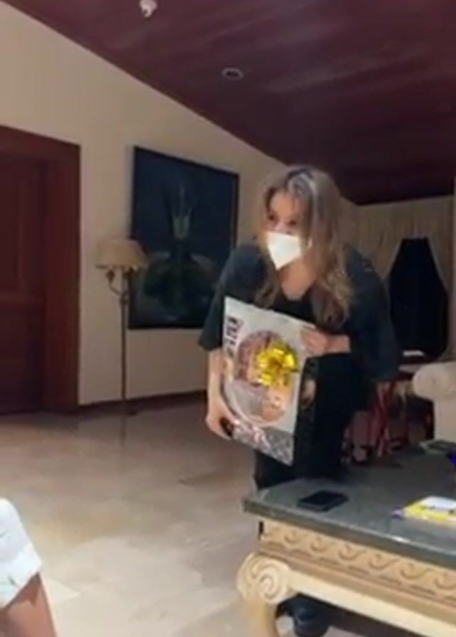 The video takes place in an indoor setting, possibly a living room or lounge, with warm-toned decor. The room features a dark wood paneled ceiling and light-colored tiled flooring. At the start of the video, a woman with long brown hair, wearing a black top and a white face mask, is holding a gift bag. The bag is decorated with Halloween-themed imagery and a gold ribbon. She appears to be addressing someone. In the background, there is an ornately detailed table with a coffee table book on it, a lamp, a piece of art featuring an Egyptian theme, and red medical mobility aid. As the camera shifts, a man with a white beard and glasses is seen sitting on a couch, along with two other women. The woman closest to the camera has long curly hair and is wearing a light-colored sweater. Another young woman with curly hair walks behind them in a white top. The woman with the gift bag is talking, apparently giving the gift on behalf of a group to the people in the room.