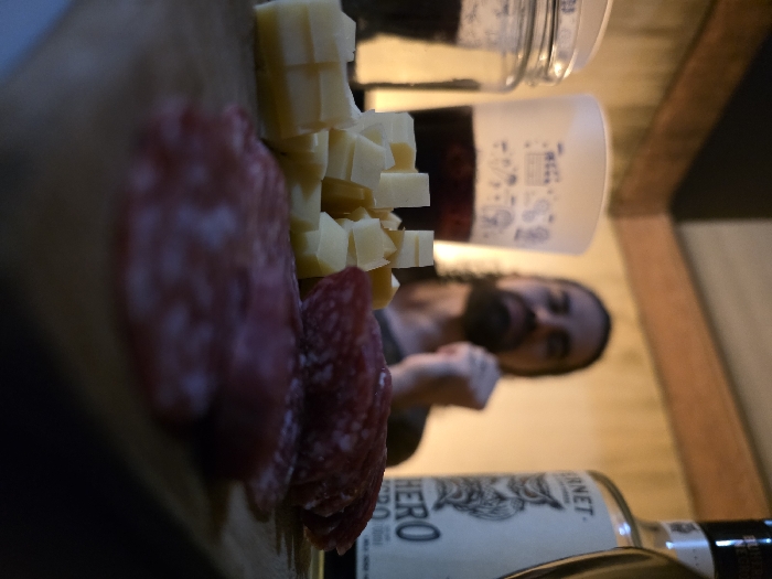 An indoor scene in Villa San Andrés, Argentina, displays a low-light setting with food and beverages. In the foreground, a wooden cutting board features an arrangement of approximately two dozen light-yellow cheese cubes on the left and multiple circular slices of reddish-pink cured meat on the right. In the mid-ground, from left to right, a clear glass jar containing a dark substance is partially visible, followed by a translucent white plastic cup holding a dark liquid and adorned with faint white illustrations. To the right of the cup, a dark glass bottle with a white label prominently displaying "FERNET" and "HERO" beneath an owl illustration is present. In the blurred background, a male figure with dark, medium-length hair and a beard is visible, wearing a dark shirt. His head is slightly tilted, and his right hand is raised, forming a loose fist near his chin or chest. The ambient lighting is dim, illuminating light-colored walls with a darker horizontal trim in the upper background.