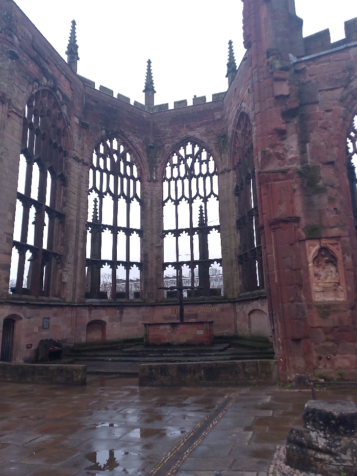 The image displays the interior of the ruined St Michael's Cathedral in Coventry, United Kingdom