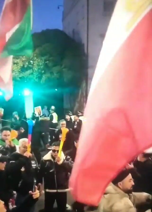 A crowd of people, predominantly dressed in dark clothing, are gathered on a city street at dusk. They are holding and waving flags featuring green, white, and red stripes, and some flags display an emblem. The crowd is densely packed, with some individuals blowing on yellow horns. A man in a tan jacket stands prominently in the foreground. Buildings stand in the background, with lights visible in some windows. A street light casts a green glow over the scene. A sign with writing in a language other than English is visible. The video seems to capture a demonstration or gathering of some kind.