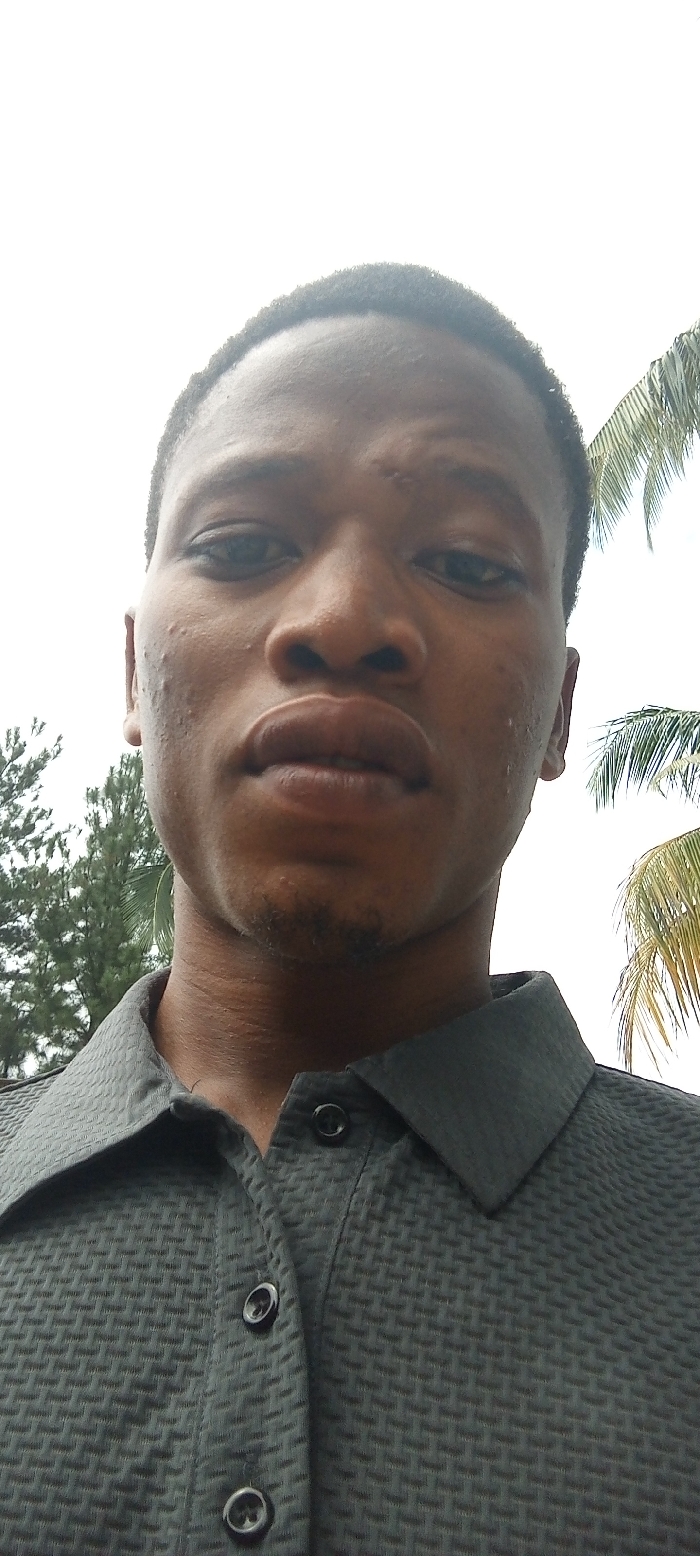 A close-up, low-angle portrait depicts a male subject outdoors in Ila Orangun, Nigeria. The individual, appearing to be a young adult with dark skin, short dark hair, and dark eyes, directly faces the camera. Minor facial blemishes are present on the cheeks and forehead, with minimal stubble on the chin. The subject wears a dark grey, textured collared shirt with three visible dark buttons on the placket, the top one unfastened. The background is a bright, overexposed sky, indicative of strong ambient light. Partial foliage is visible on both sides of the subject: a dense cluster of dark green, possibly coniferous, tree branches to the left, and a yellow-green palm frond to the right. The composition suggests a self-portrait taken from a slightly upward angle.