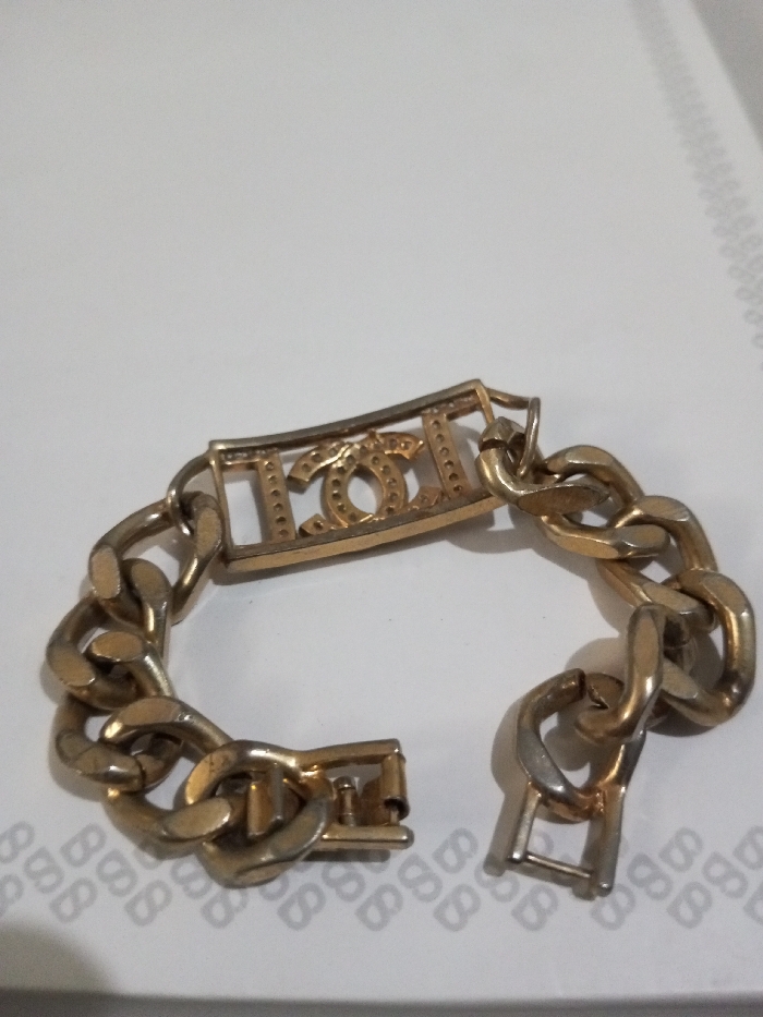 A gold-toned metal link bracelet is observed on a white surface with a faint, repeating textual or symbolic pattern in Chandragiri, Nepal. The bracelet is constructed from large, interlocking curb-style links. A central rectangular bar section, integrated into the chain, features cut-out block letters spelling 'CHANEL' and an interlocking double 'C' logo embellished with small, clear stones. The bracelet's clasp mechanism, appearing to be a fold-over or box style, is open and disengaged. The metal surfaces exhibit signs of wear, including areas of dullness and minor discoloration.