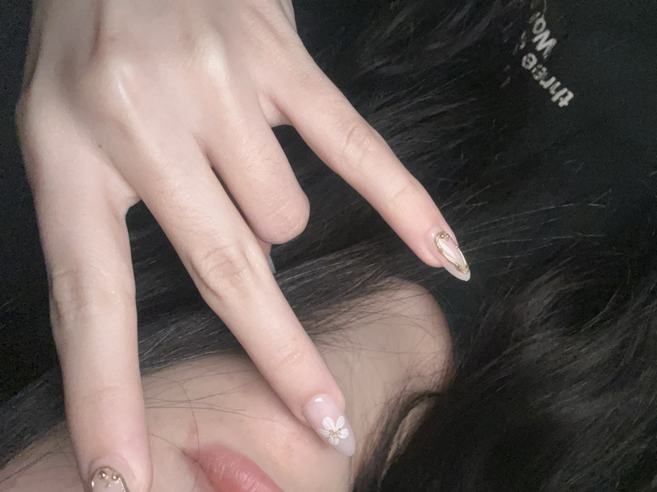 A close-up photograph depicts the upper torso, lower face, and hands of an individual in the city of Cachan, France. The scene is situated indoors or in a controlled environment with a uniformly dark, indistinct background. The subject's skin tone is light. The lower left portion of the face is visible, showing a chin and a lower lip with a light pink lip product applied. Long, dark hair, likely black or dark brown, frames the face and extends into the lower frame. The individual's right hand is prominently featured in the upper center, making a gesture with the index finger and pinky finger extended, while the middle and ring fingers are curled. The thumb is partially extended and slightly bent. The nails on this hand are manicured to an almond shape with a translucent base; specifically, the pinky nail displays an abstract design of gold-colored lines and small gold spherical embellishments. A portion of the left hand is visible on the upper left, showing the thumb and index finger. The index finger nail of the left hand is similarly manicured with a translucent base and features a white floral decal. The thumb nail also appears to have gold embellishments. The subject is wearing a dark, likely black, garment, possibly a t-shirt or sweatshirt. Partial white lettering, reading "three" and "Wa," is visible on the garment in the lower right section of the image. Lighting is soft, appearing to originate from the front or slightly above the subject. The image content does not provide specific external geographical markers within Cachan.