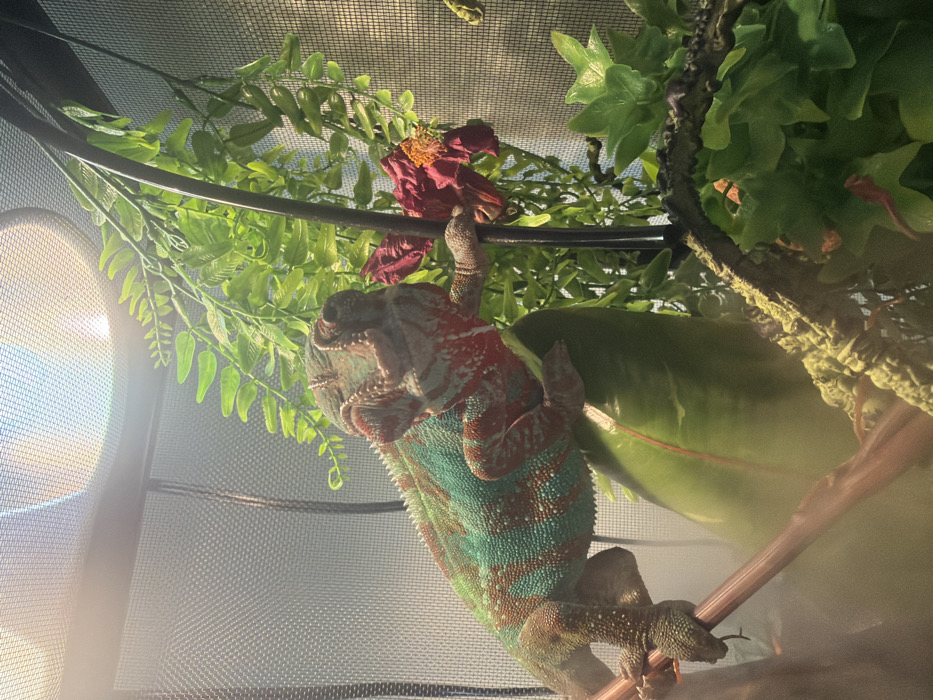- "A chameleon, predominantly teal with red patterns, hangs upside down, gripping a black bar with its front left foot" by FM-FHe0a2, licensed under CC BY 4.0