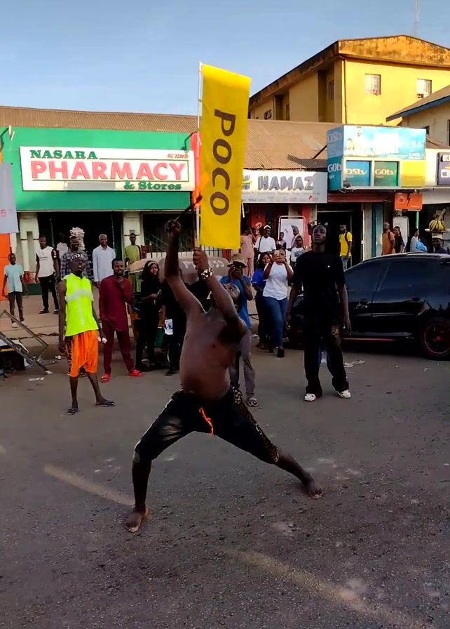 A shirtless man is captured on video performing a fire-breathing stunt on an asphalt street in front of a crowd. The man is barefoot, wearing black shorts with patterns, and holds a flaming torch in his right hand. He is captured in mid-act, exhaling a large burst of fire from his mouth. Behind him, a diverse crowd of onlookers stands near parked vehicles, capturing the scene on their phones. In the backdrop, buildings with commercial signage, including a pharmacy and "HAMAZ," provide context to the street scene. A yellow banner with the word "POCO" is visible on the left side of the frame.