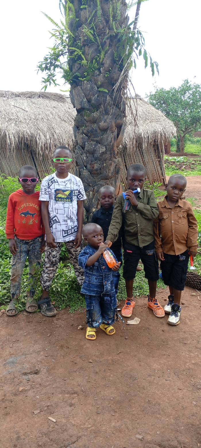 A vertical image captures seven children standing outdoors in Fizi, Democratic Republic of the Congo