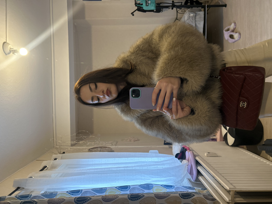 A young adult female is depicted in a mirror selfie taken within a private interior space in Strasbourg, France. The female has long, dark brown hair, winged eyeliner, and wears a light brown, presumably faux fur, cropped jacket over light-colored pants. She holds a light purple smartphone in both hands, angled to capture her reflection, while making a pouting expression. A red quilted Chanel handbag with a silver 'CC' logo and chain strap is slung over her shoulder. Her fingernails are manicured in a French style, and rings are visible on her index fingers. The reflected environment includes a window on the left with white sheer curtains layered over patterned curtains featuring blue and green leaf-like designs. A white radiator is positioned below the window, and a pair of light purple slide sandals rests on the floor nearby. To the left of the female's lower body, a black and white patterned stool or pouf is visible. The background on the right shows part of a bed with a grey blanket and a light blue bag hanging from an unseen fixture. String lights or decorative beads are faintly visible hanging on the wall. The ceiling is white, featuring a single, exposed light bulb fixture.