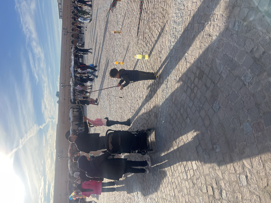 A stone-paved square hosts a crowd, mostly walking left to right. A child in a dark jacket manipulates a stick near two orange and yellow objects on the ground. Sunlight casts long shadows. The blue sky is visible above the buildings. A stroller and people holding sticks are also visible.