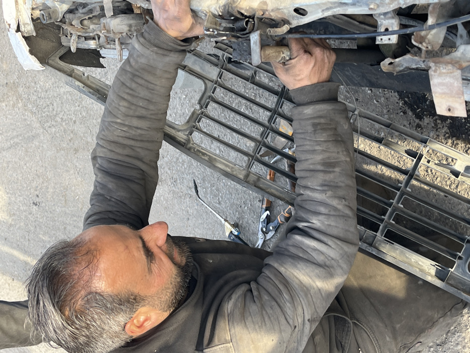 This image, taken in At-Tall, Syria, depicts a male individual actively engaged in vehicle repair or disassembly