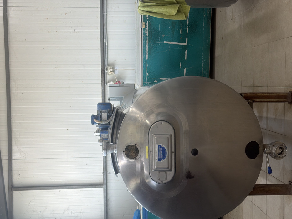 The scene depicts an interior view of an industrial or storage facility located in Bliznatsi, Bulgaria. No individuals are present. The foreground is dominated by a large, horizontal, cylindrical stainless steel tank, supported by two rusty, square-profile metal stands. A blue electric motor assembly is mounted on the top of the tank. Below the motor, a circular opening on the tank's upper surface contains dark, granular organic matter. A rectangular control panel or access hatch is affixed to the side of the tank. A drain port with a blue-handled valve is visible at the bottom of the tank. In the mid-ground to the right, a distressed, teal-colored industrial chest or freezer with faded white markings is positioned against a white, ribbed wall. A light green towel hangs over a dark grey container or bin situated adjacent to the teal chest. The wall behind the equipment consists of white corrugated or ribbed panels with a dark grey horizontal structural beam running near the top. An electrical outlet labeled "220V" is visible on the wall, accompanied by a red electrical box and grey conduit. The floor is composed of light-colored, square ceramic tiles.