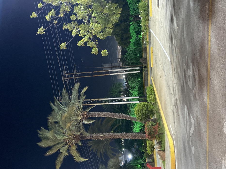 Night scene featuring palm trees silhouetted against a dark blue sky with power lines visible. Lush green foliage and landscaping border a grey concrete parking lot with yellow painted curbs. Streetlights illuminate the background, adding to the nocturnal ambiance.