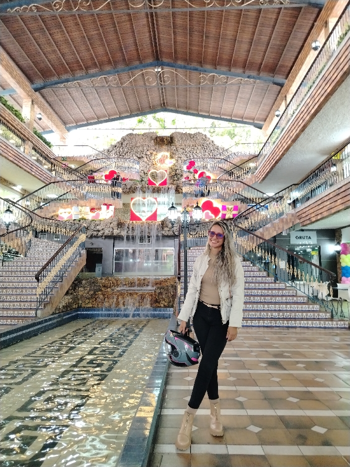 The image depicts the interior of a multi-level commercial center, identified as Centro Comercial La Cascada in Carrizal, Venezuela. A female subject stands in the foreground, slightly right of center, on a tiled floor with light and dark square patterns. She is a light-skinned woman with long, wavy blonde hair and dark roots, wearing sunglasses, a cream-colored jacket, a beige top, black skinny jeans, and light beige platform ankle boots with front zippers. In her left hand, she holds a grey motorcycle helmet accented with pink. She is smiling towards the camera. Behind the subject, a shallow water channel with tiled patterns on its base extends towards a large, central artificial rock formation acting as a waterfall, with water cascading into the channel. Symmetrically flanking this waterfall are two wide staircases with ornate metal balustrades and gold-colored handrails, featuring risers decorated with blue and white tiles. The rock formation and stair areas are extensively decorated with illuminated heart-shaped lights, some glowing red or pink, along with other romantic-themed decor such as illuminated gift boxes and red floral arrangements. The structure extends upwards with multiple visible levels, featuring balconies and additional railings. The roof consists of wooden panels and decorative metalwork, with openings revealing natural light and exterior vegetation. Blurred figures are visible on the upper levels and staircases. A sign reading "GRUTA" is visible on the upper right side, indicating a store or section.
