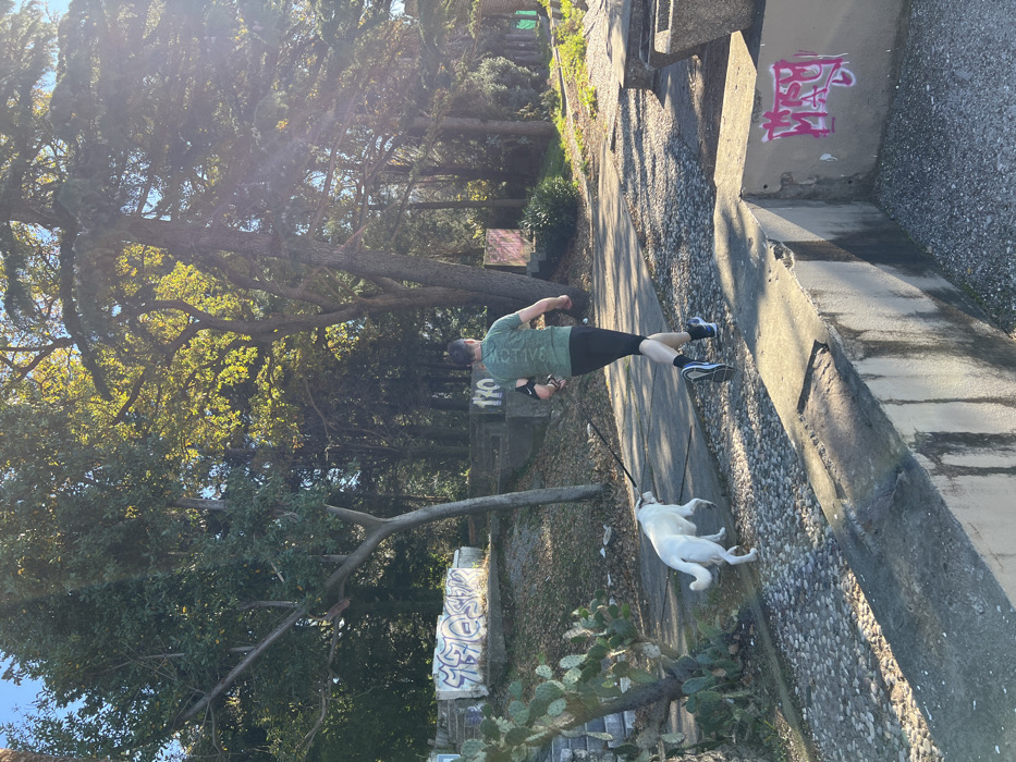 This image depicts a daylight outdoor scene in Kamenovo, Montenegro. A male individual is observed from behind, running from left to right along a path. He is wearing a green short-sleeved t-shirt with "ACTIVE" printed vertically on the back, black athletic shorts, and athletic shoes (one blue, one black/white). An armband is visible on his left upper arm. A white dog, resembling a Labrador, runs alongside him on a black leash. The path beneath the person and dog consists of a smoother concrete strip to the left and a darker, pebbled or gravel surface to the right. In the immediate foreground, a low, worn concrete structure extends across the bottom right of the frame, featuring pink graffiti spelling "MAU." To the left of the path, a multi-stemmed tree with green leaves stands near a concrete structure adorned with white and purple graffiti. A large cactus plant with multiple pads is visible to the far left. Further into the background, additional concrete structures, some bearing indistinct graffiti like "1TO," are partially obscured by dense tree foliage. The trees exhibit varied green hues, suggesting different species, and are illuminated by strong sunlight, indicating clear weather. The sky is visible as bright blue at the top.