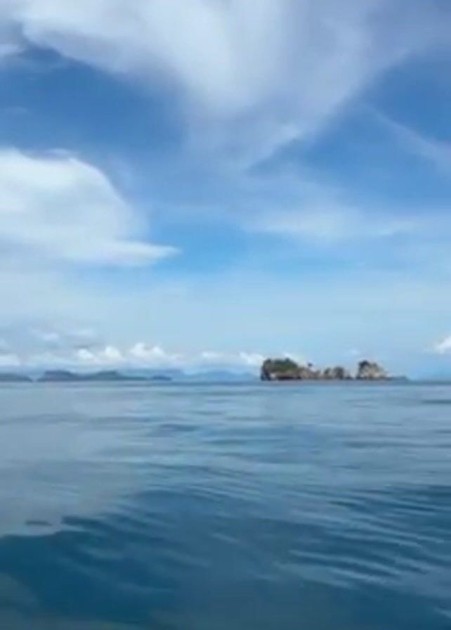The video depicts a seascape featuring a clear blue sky with scattered white clouds above a calm, deep blue ocean. In the distance, a small, rocky island is visible, partially covered with some green vegetation. Further in the distance, landmasses are faintly visible on the horizon. The camera appears to be positioned on a moving boat, as evidenced by the slight ripples and wakes visible on the water’s surface in the foreground. The overall scene is serene and tranquil.