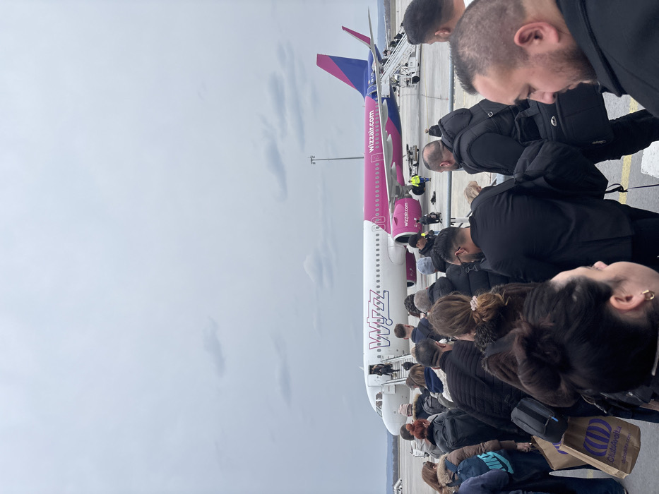 - "An outdoor scene at Varna Airport, located in Aksakovo, Bulgaria, depicts a large group of approximately 30-50 individuals queuing on an asphalt tarmac under a uniformly overcast sky" by FM-EuaZB3, licensed under CC BY 4.0