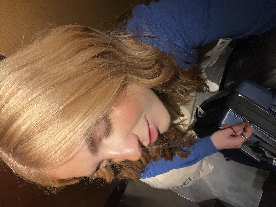 The image displays a close-up, high-angle view of a female individual within Chengguan District, China, in a dimly lit indoor environment. The subject possesses light blonde, wavy hair and fair skin, with visible blush on her right cheek. Her eyes are directed downwards, and her lips are slightly parted. She is wearing a blue long-sleeved sweater over a lighter-colored garment or bag, which features partially visible green lettering, possibly "MODEL". A small, circular gold-colored pendant necklace hangs around her neck. Her left hand, adorned with a prominent red ring and several other rings, rests upon or holds a dark blue, rectangular object resembling a hard-shell case. The background is indistinct, appearing dark brown or black.