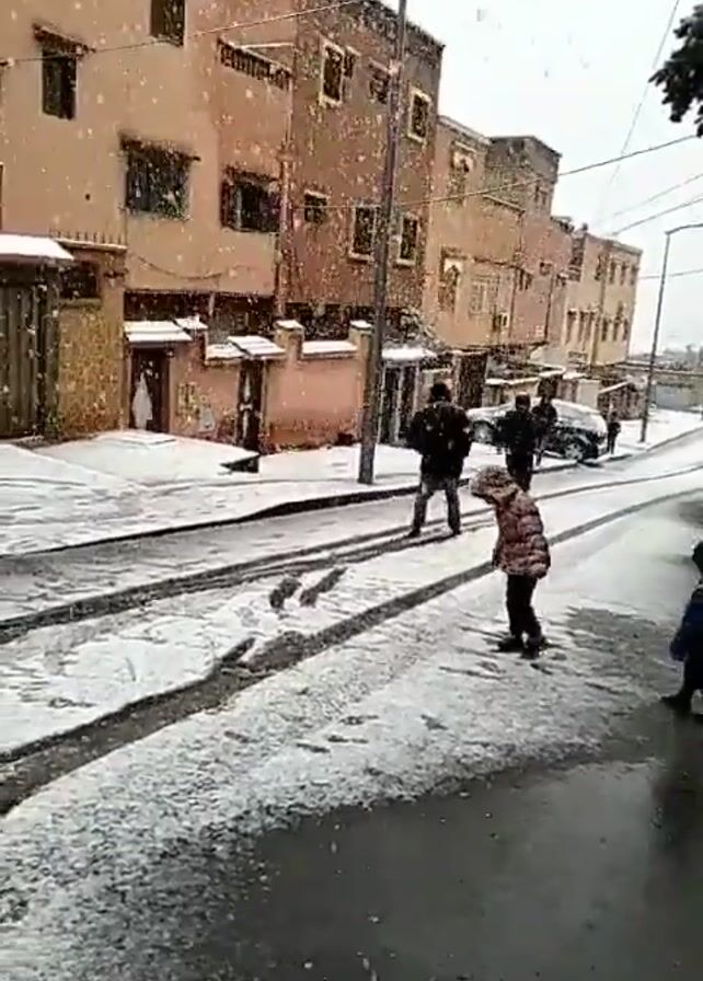 street scene in what appears to be a city with buildings of similar height and architectural style lining the road. It is snowing, and a layer of snow covers the ground. The road is partially covered in snow and appears wet in places. There are a few people walking on the street, including two young children, one in a pink and black coat and the other in a blue coat. Behind the children, three adults walk away from the camera. A car is parked on the side of the street, also covered in snow. Overhead power lines are visible, and streetlights stand on the sidewalk. The weather is overcast and the overall lighting is dim due to the snowfall.