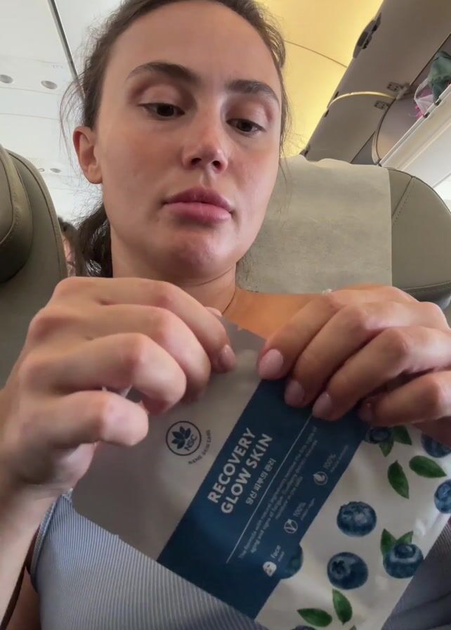In an interior medium shot, a woman sits in an airplane seat, looking directly at the camera and holding up a sheet mask