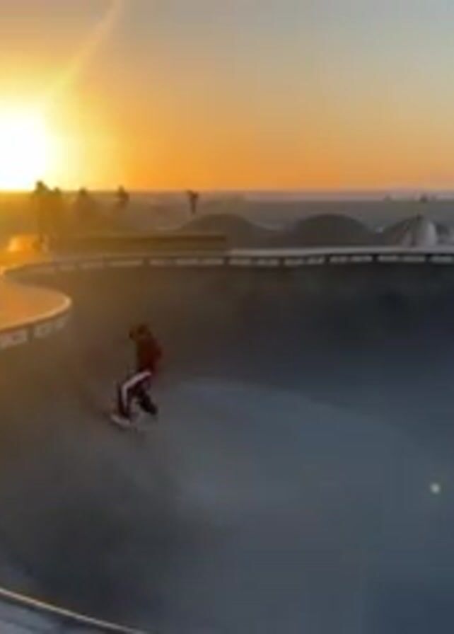 The scene is a public skate park with an elaborate bowl design, likely made of concrete, set against the backdrop of a sunset over a beach