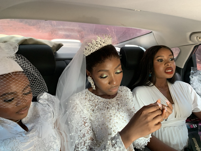 The scene is situated inside the rear passenger compartment of a vehicle, in the city of Ankpa, Nigeria. Three adult females occupy the back seat. The central figure, presumed to be a bride, wears a white, long-sleeved, embellished gown adorned with pearls and lace, a tiara, and a white veil. She has full facial makeup, prominent green eyeshadow, and large pearl drop earrings. Her gaze is directed downwards at her hands, which are clasped and appear to be manipulating a small, light-colored object, possibly an accessory. To her immediate left (viewer's left), another woman is partially visible, wearing a light-colored, possibly white, formal top with a patterned texture and a white hat featuring a small birdcage veil covering her face. She is looking downwards. To the bride's right (viewer's right), a third woman wears a white, pleated dress. Her mouth is slightly open, and she is looking forward or slightly right. She has visible makeup, including dark lipstick, and her right hand is near the bride's left hand. The vehicle's interior features dark upholstery for the seats and lighter-colored ceiling. Through the rear window, a blurred reddish-brown background is visible, suggesting an outdoor environment. A partially visible cardboard box with text is on the floor to the right.
