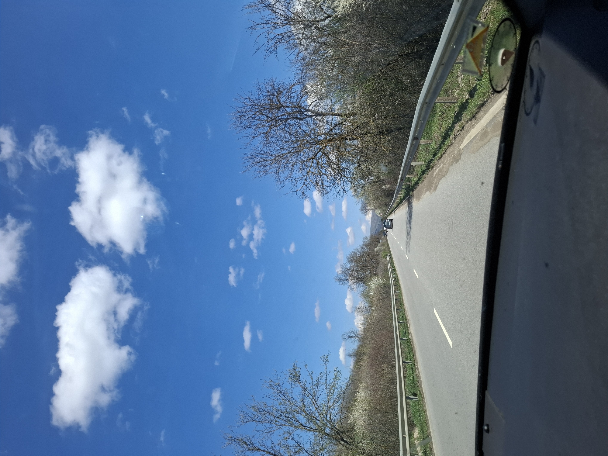 view from a moving vehicle on a road in Blagovo, Bulgaria. The road has a guardrail, grass, and trees on the right side. The sky is blue with scattered white clouds. There is another vehicle visible in the distance on the road. The image is taken at an angle, and part of the vehicle's interior is visible in the foreground.