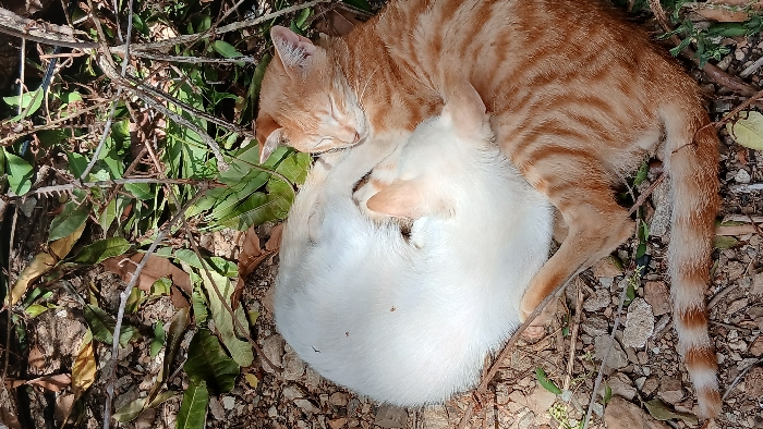 - "The image displays two domestic felines resting intertwined on the ground in La Tagua, Venezuela" by FM-6pxXE3, licensed under CC BY 4.0