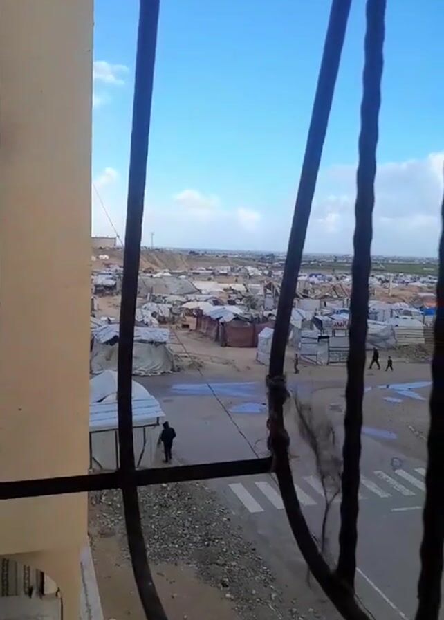 view from a high window, partially obstructed by dark metal bars. Outside, there is a refugee camp with numerous tents and makeshift dwellings, spread across a wide, dusty landscape under a blue sky with scattered clouds. A road runs through the camp, with a crosswalk visible in the foreground. Several people are walking in the camp.