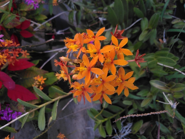 The image presents a detailed close-up of a cluster of approximately 15 to 20 small, vivid orange flowers, each featuring five petals and some displaying yellow central stamens. This primary floral cluster occupies the central frame and is in sharp focus. Surrounding the central flowers, in the midground and lower frame, is a dense arrangement of green foliage, consisting of various leaf shapes and slender stems. The background, significantly out of focus, reveals additional plant matter: prominent red leaves, smaller clusters of similar orange flowers, and a scattering of purple flowers in the upper left quadrant. A grey, textured surface, possibly concrete or stone, is partially discernible behind the foliage on the left side of the frame. The scene is situated in Los Teques, Venezuela.