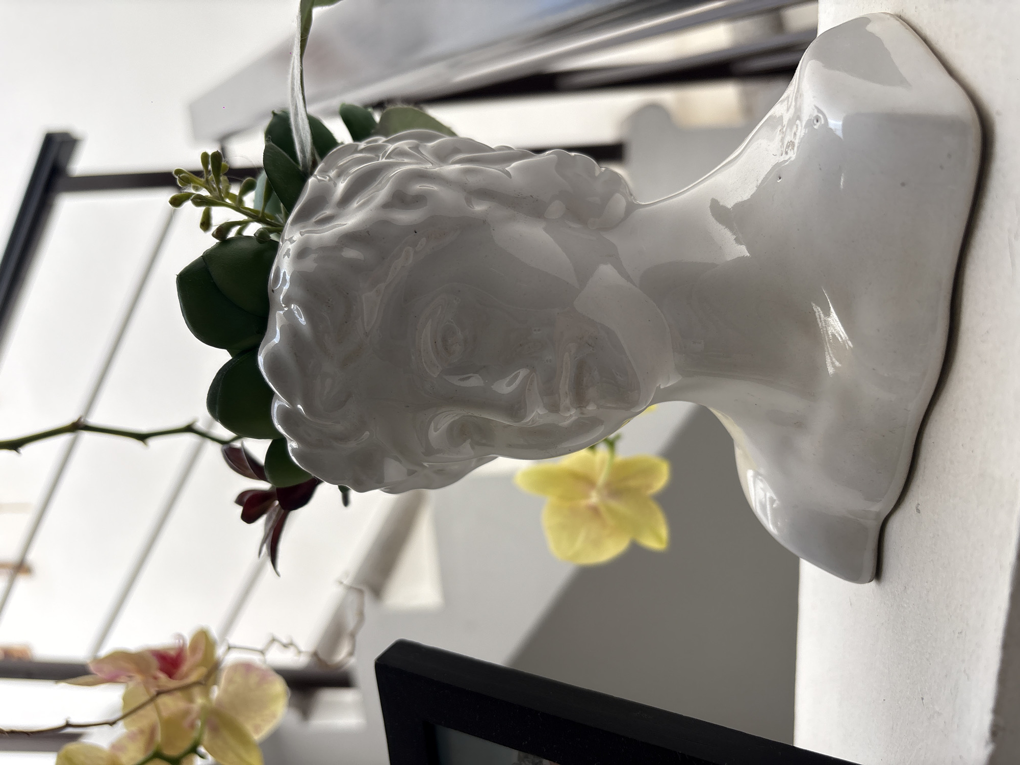 - "In San Juan Cuautlancingo, Mexico, a white, glossy ceramic bust, sculpted as a classical male head with curly hair, is positioned on a light-colored, flat surface, functioning as a planter" by FM-QFzAz2, licensed under CC BY 4.0