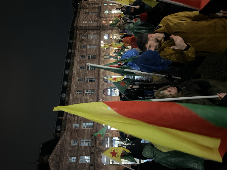 A nighttime demonstration is underway. People hold flags featuring a yellow, red, and green horizontal tricolor with a red star. The gathering takes place in front of a multi-story stone building illuminated with lights. Participants wear various jackets, and some are sheltered under rain gear. The overall atmosphere suggests a political rally or protest.