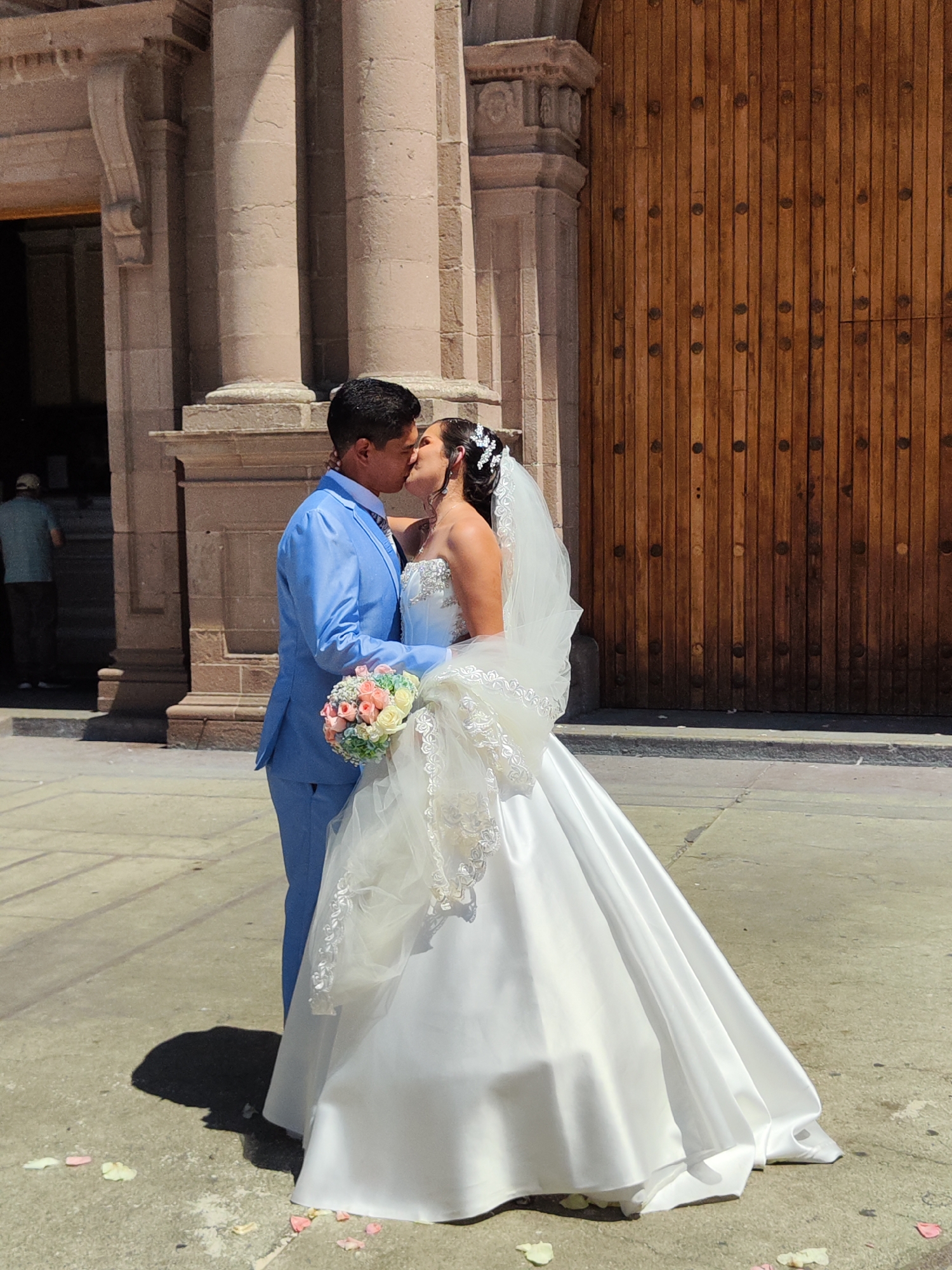 A newly married couple kisses on a plaza in Tacna, Peru. The bride wears a white strapless ballgown-style dress, with white lace and beading at the top. A white veil with a beaded headband adorns her head. She carries a colorful bouquet. The groom wears a light blue suit and kisses the bride. They stand in front of a large stone building with a large brown wooden door. Petals lie on the ground in front of them. A man in a green shirt is seen in the background, entering the building.
