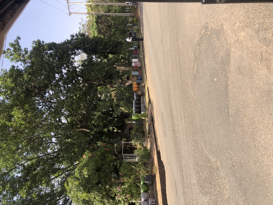 The image displays a roadside scene in Jos, Nigeria, under a clear, bright sky. A two-lane asphalt road with visible wear and discoloration occupies the foreground and midground. To the left, a raised concrete curb and shallow drainage channel separate the road from a vibrant roadside display area. This area features a dense arrangement of various large decorative planters and pots, including cylindrical, flared, and rectangular shapes, in colors such as bright green, grey, black, brown, orange, and white. Behind these items, lush green foliage and several large, mature trees with full canopies are visible. A white, arched metal garden trellis or gateway is partially discernible amidst the greenery on the left. Two individuals are present on the right side of the frame, near the road's edge. One person, dressed in a light-colored long-sleeved shirt and dark trousers, stands facing left, observing the roadside display. Further down the road, a second individual is partially visible on the far right, mostly obscured by a dark vertical element in the foreground. In the background on the right, additional trees and at least two wooden utility poles with multiple overhead wires extend into the distance. The overall scene suggests a commercial area focused on horticulture or home decor, situated along a public road.