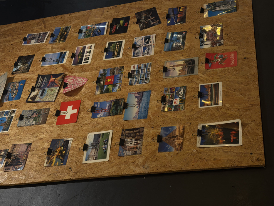 A plywood board is affixed to a dark surface. It displays a collection of postcards held in place by black binder clips. The postcards feature diverse locations, including cityscapes, landscapes, and landmarks from various countries. The arrangement is fairly orderly, creating a wall display reminiscent of a travelogue or memory board.