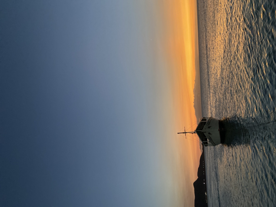 An unobstructed view depicts a single, traditional-style boat anchored in the tranquil waters of Juan Griego, Venezuela, during twilight. The boat, centrally positioned in the lower mid-ground, features a white hull with dark accents on its upper structure and a prominent mast. A dark line, presumed to be a rope or anchor line, extends from the bow of the boat into the water towards the bottom of the frame. The water exhibits gentle ripples, reflecting the vibrant sky. The sky transitions from a deep blue at the zenith, gradually lightening and then merging into a band of intense orange and yellow hues along the horizon. To the left, a dark, silhouetted landmass, possibly mountains or hills, is visible in the distance, featuring several small, illuminated points of light. To the right, a faint, hazy landmass or cloud formation extends along the horizon line. No individuals or active interactions are visible in the scene.