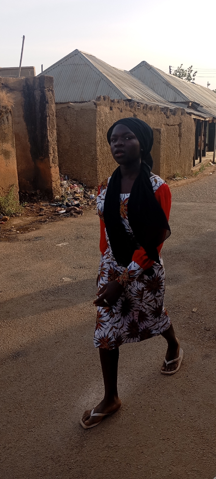 A young dark-skinned individual is depicted walking left-to-right on a paved, light-brown road. The individual wears a black head covering, a long-sleeved dress featuring red sleeves and a patterned white, red, and brown torso/skirt section, and light-colored flip-flops. Their head is turned towards the viewer, with a neutral expression and slightly parted lips. To the immediate left of the individual, a significant pile of refuse, including plastic bags and general debris, is accumulated against a dilapidated, unrendered brown wall. The background consists of a row of low-rise buildings with rough, unrendered brown walls and corrugated metal roofs. The scene is illuminated by natural light, characteristic of an urban or semi-urban street environment in Jos, Nigeria.