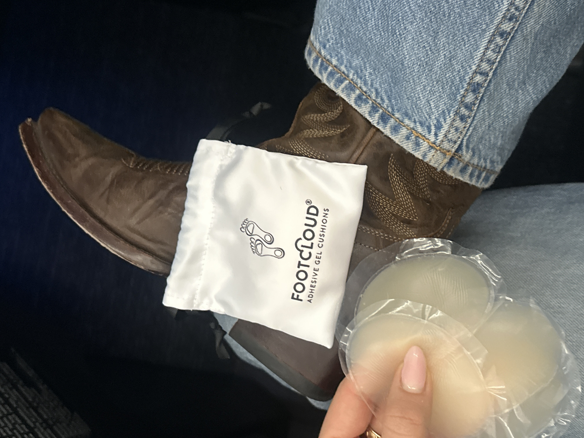 person wearing a pair of brown cowboy boots and blue jeans. On top of the boots is a small white bag with the brand name "Footcloud" and the words "Adhesive Gel Cushions" printed on it. In the person's hand are several clear, circular gel cushions in plastic packaging. The scene appears to be indoors, possibly on a plane or in a car, given the dark background behind the objects. The location is unknown, and the image does not suggest it is Los Angeles, California, United States of America.